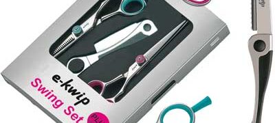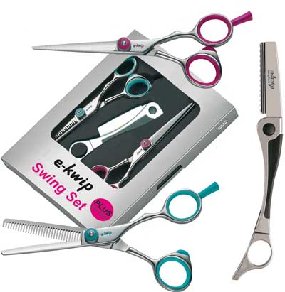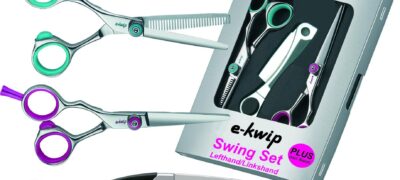 Das Scherenset für Linkshänder bestehend aus: -e-kwip Schneideschere 5,5″, Ergoform, pink -e-kwip Modellierschere, 5,5″, 30 Zähne, Ergoform, türkis -Klingenmesser mit original Feather Klinge -40616L
