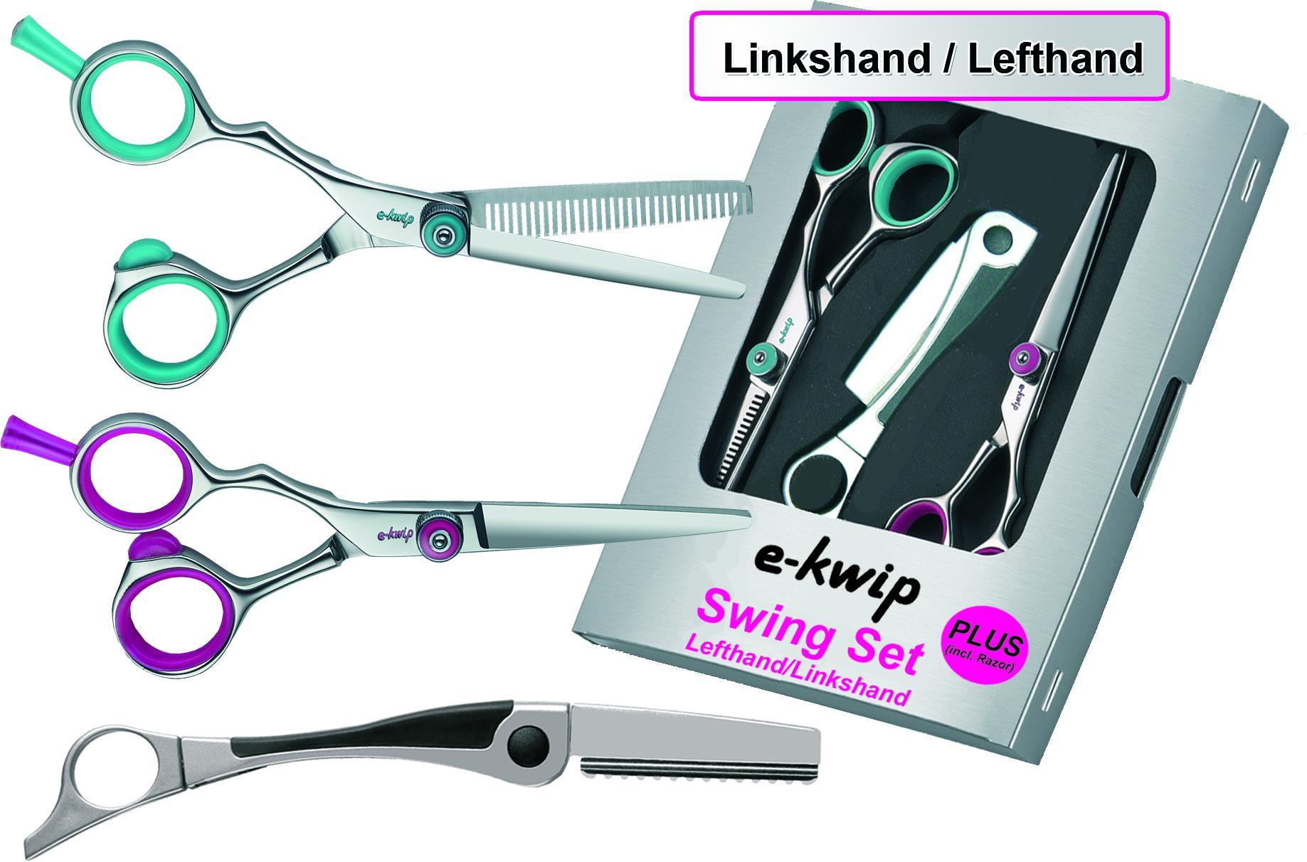 Das Scherenset für Linkshänder bestehend aus: -e-kwip Schneideschere 5,5″, Ergoform, pink -e-kwip Modellierschere, 5,5″, 30 Zähne, Ergoform, türkis -Klingenmesser mit original Feather Klinge -40616L